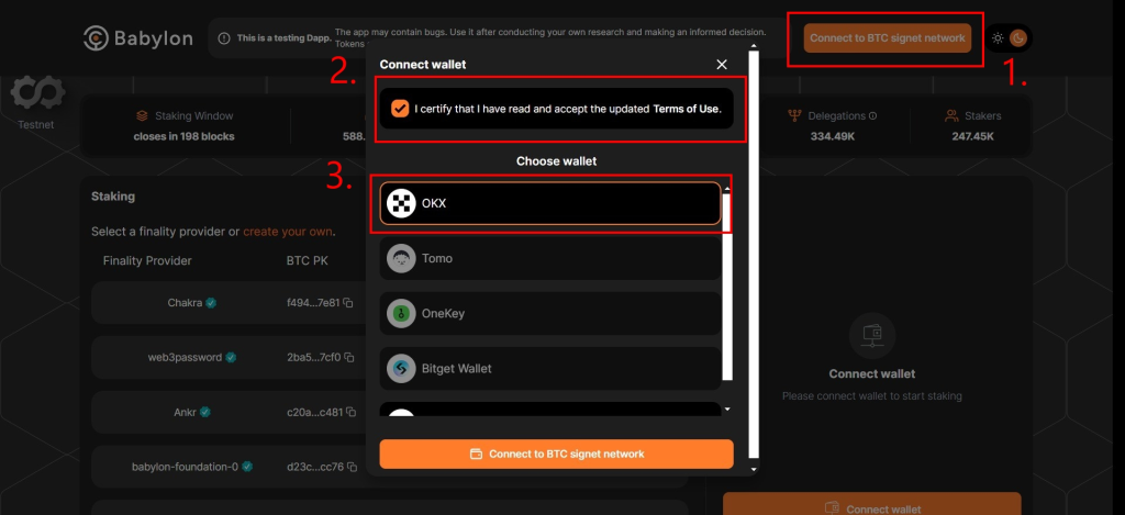 - 進入 Babylon 質押網站︰https://btcstaking.testnet.babylonchain.io/