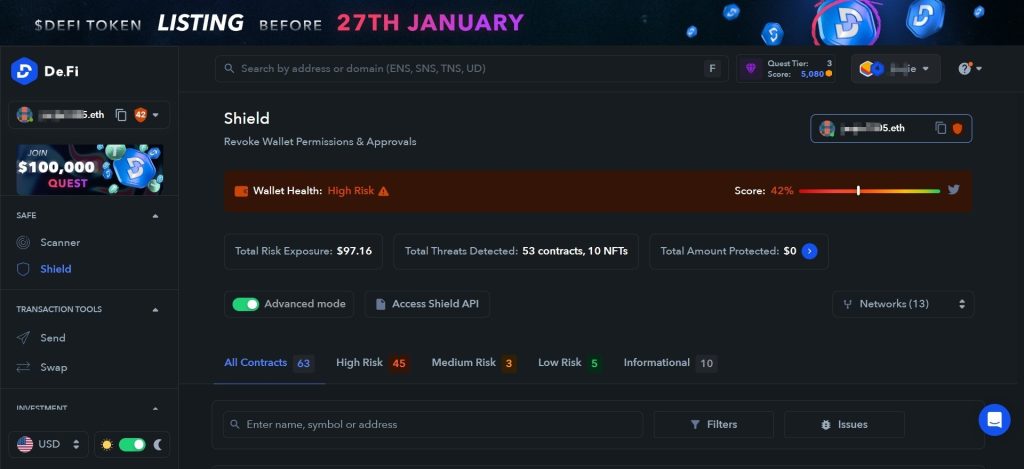 在這個介面,系統就會自動幫你掃描錢包裡的合約是否安全,接下來帶你操作一次取消高風險的合約授權吧。