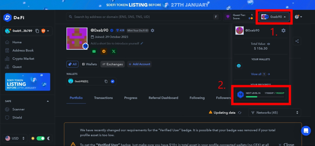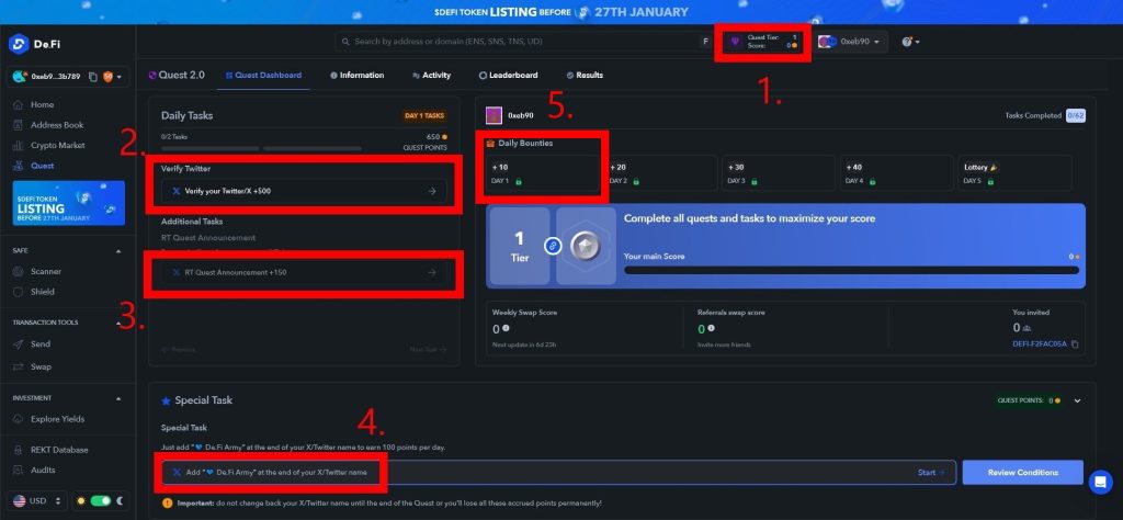 - 特別任務,綁定錢包及Twitter+轉發貼文+名字後面加上「藍色愛心 De.Fi Army」(改名字每天多100分)。