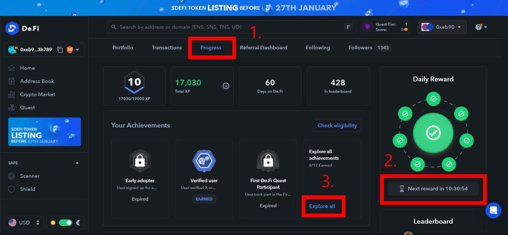 - 進到任務介面後,圖二步驟一點擊「Progress」,步驟二是每日簽到,步驟三是一次性勳章,有點像是解成就的概念,裡面有很多不同的成就,比方說資產達到100美元或是驗證 X 及 Telegram帳號等,大部分都是很簡單的任務。