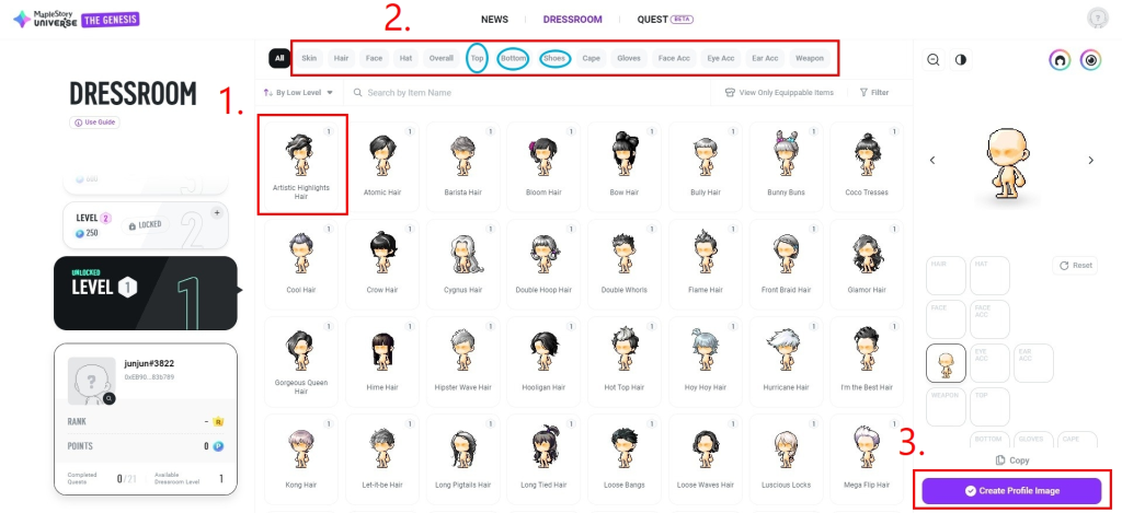 - 照上面的選項依序打扮自己。(藍色圈圈 Top 是指套裝,選了套裝就不能選後面兩個 Bottom 及 Shoes 了,這裡沒有差,都可以。)