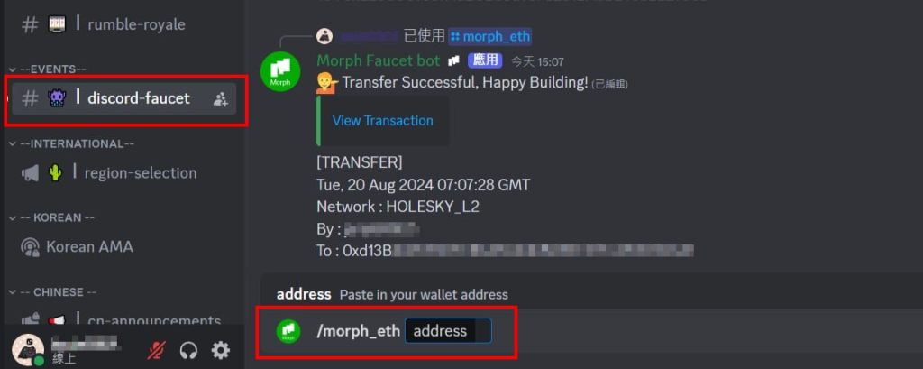 - Discrod 群組裡,找到 discord-faucet 頻道後複製 “/faucet address:”,最後面打上自己的錢包地址。(記得複製的時候前後不要有空格)