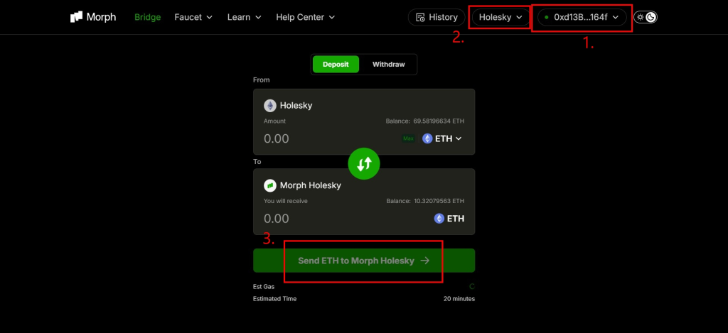 上面教的進 Discord 領 Morph Holesky 測試幣,基本上是不夠的,所以我們要從 Holesky 測試網跨很多 ETH 過來,沒聽錯要很多, 20 個左右比較理想,而這剛好也是官方的交互任務。