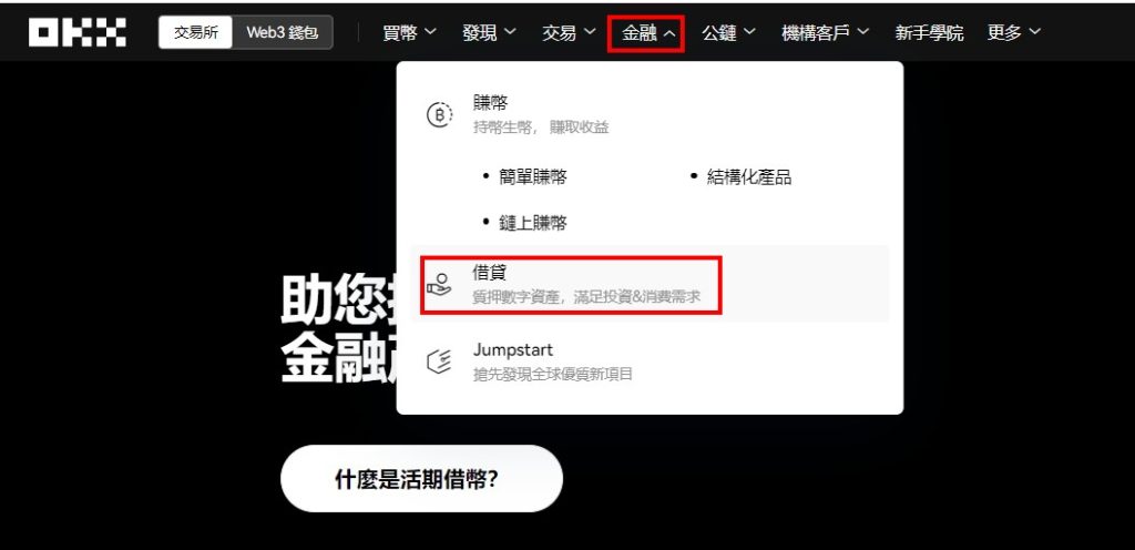 在OKX平台上就有借幣的服務,首先在金融裡面找到借貸這個選項。