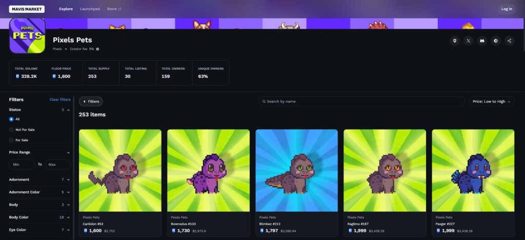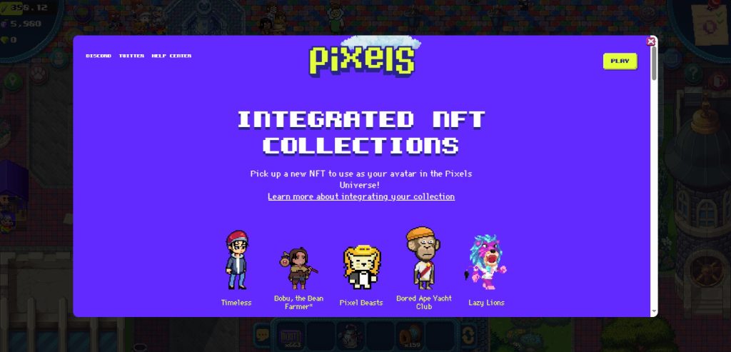 - 整合超過70種NFT至個人角色︰知名的NFT有像是Bored Ape Yacht Club、CryptoPhunks、Pudgy Penguins及Mocaverse等,只要連結到你的錢包地址,就會自動匯入,就能自由選擇你喜歡的角色造型啦。如果在這之中都沒有你擁有的NFT,當然你也可以提交到Pixels團隊,等待通過之後就可以了。