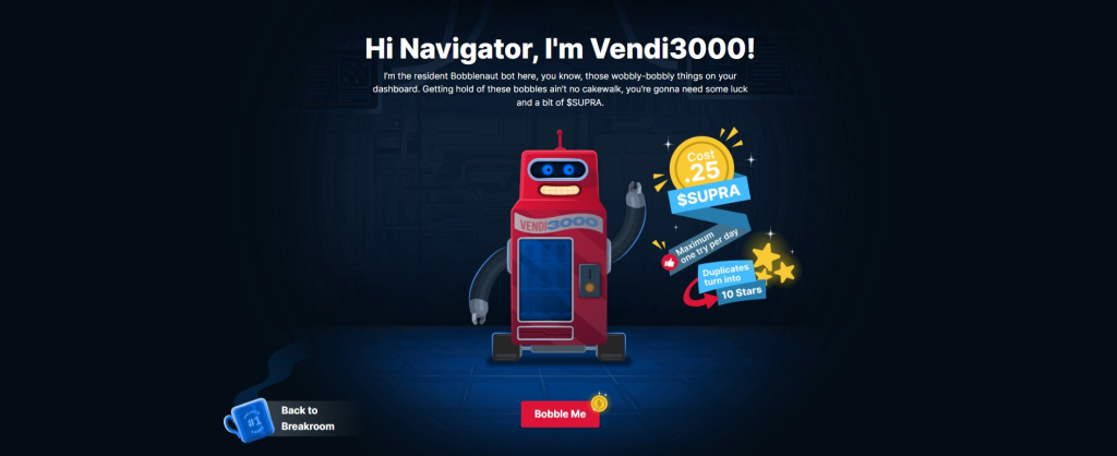 每天花 0.25 顆 $SUPRA 代幣來參加,可以獲得角色,如果你抽到的角色有重複,可以獲得 10 顆星星。
