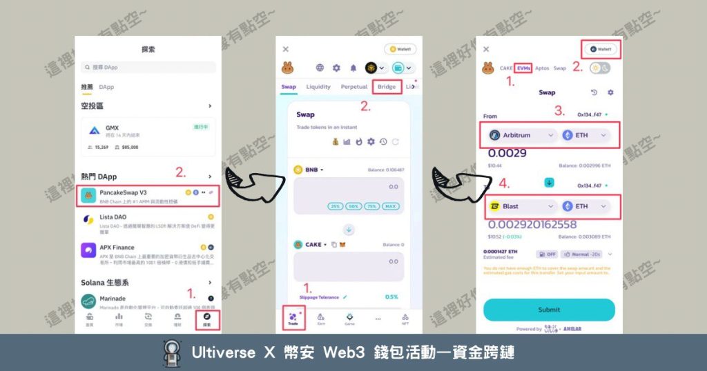 - 使用 PancakeSwap 跨鏈功能。(如下圖,建議最少轉 5u 以上,Blast 鏈的 gas 比較貴 )