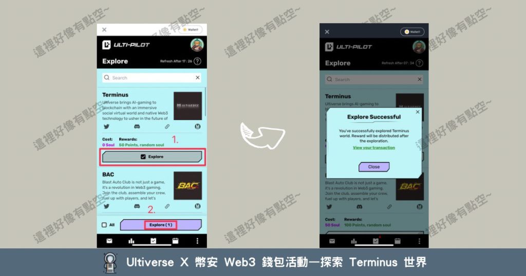 只解第一個任務,其實只要「Explore」就可以了,會花點 Gas 。